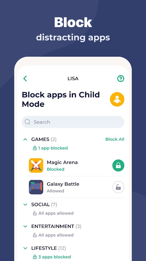 ✔ Пользовательские режимы: блокируйте выбранные приложения в разное время, чтобы стимулировать соответствующее поведение, например. разрешить образовательные приложения во время выполнения домашних заданий, а игры — только в свободное время