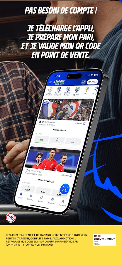 Делайте ставки с легкостью с помощью приложения Parions Sport: регистрация не требуется, готовьте свои спортивные ставки в любое удобное время, отправляйтесь в пункт приема ставок и делайте ставки наличными или кредитной картой.