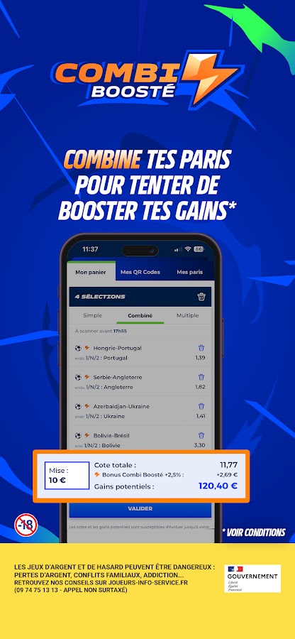 В приложении доступно больше спортивных ставок, чем в бумажном купоне. Широкий выбор видов спорта: футбол, теннис, баскетбол, регби, хоккей… а также крупнейшие спортивные соревнования: Лига 1, Премьер-лига, Ла Лига, Лига чемпионов, Лига Европы, Ролан-Гаррос, НБА, ММА, Олимпийские игры… и ставки: бомбардир, тайм-аут, комбинированный бонус (предварительно выбранная комбинация с повышенными коэффициентами)… Не уверены в прогнозе? Наш форум позволяет обсудить его с другими игроками и получить лучшие советы для вашей следующей спортивной ставки.