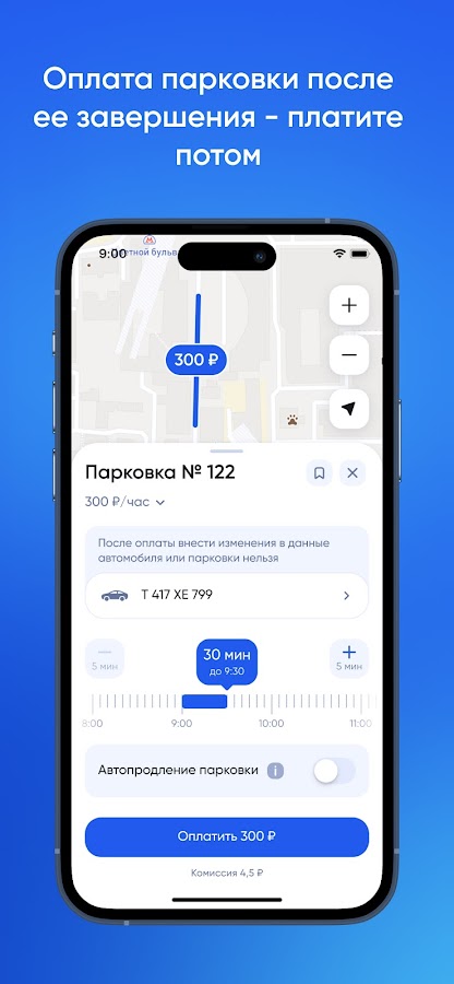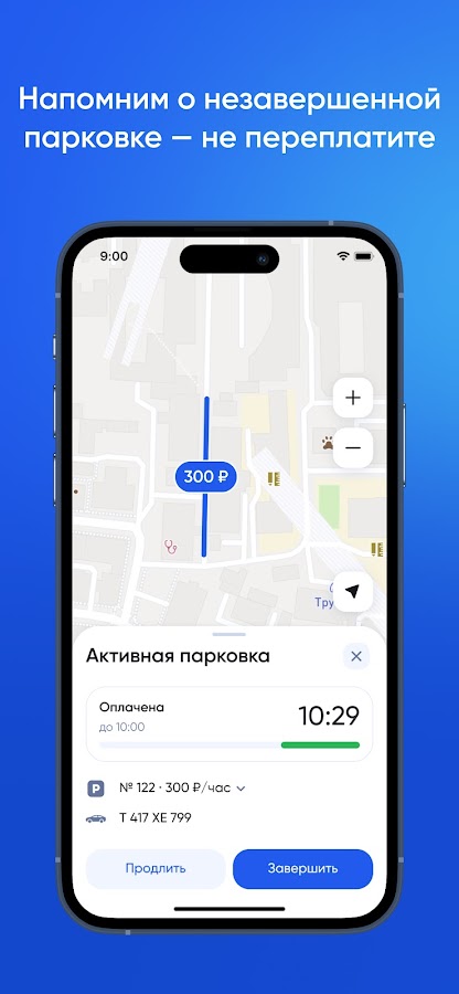 • Умные напоминания: приложение уведомит вас о необходимости завершить или продлить парковочную сессию, чтобы избежать штрафов.