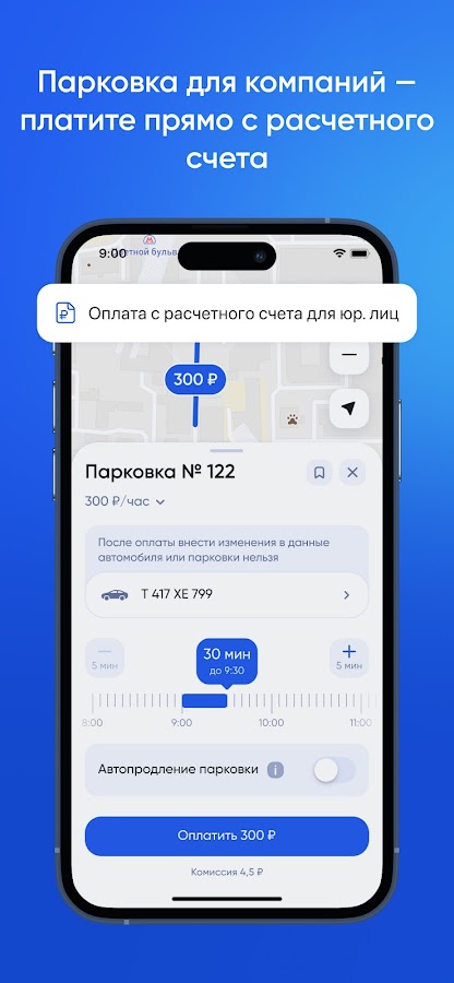 • Оплата парковки по факту: привяжите банковскую карту и оплачивайте только за фактическое время парковки без авансовых платежей.