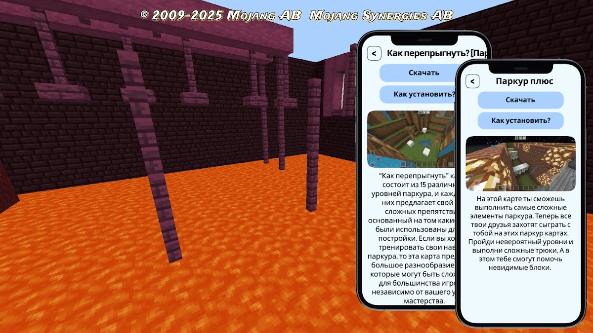 Каталог-установщик содержит паркур в майнкрафте 1.20 — это дополнения к игре, которые могут добавлять новые карты, полосы препятсвий, ловушки, блоки различного назначения или, даже, дроппер. В приложении пользователи могут просматривать, искать и устанавливать паркур карты для minecraft 1.17 и обновлять уже установленные. Приложение станет удобным инструментом поиска и установки паркур моды на minecraft 1.16. А так поможет получить крутые скины и обои для майнкрафта, которые вы сможете использовать в качестве заствки любимой игры на телефон.