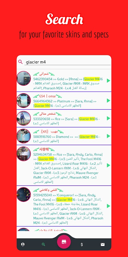 PAS Store предлагает вам функцию поиска, в которой вы можете искать некоторые желаемые характеристики учетной записи PubgM, которую хотите купить, вы можете искать желаемый скин оружия, желаемых игровых персонажей и желаемый рейтинг учетной записи, то есть вы можете ввести » Glacier »на панели поиска и все учетные записи в магазине PAS со скинами« Glacier »будут перечислены на ваш выбор (например, Glacier M416, Glacier AKM, …).