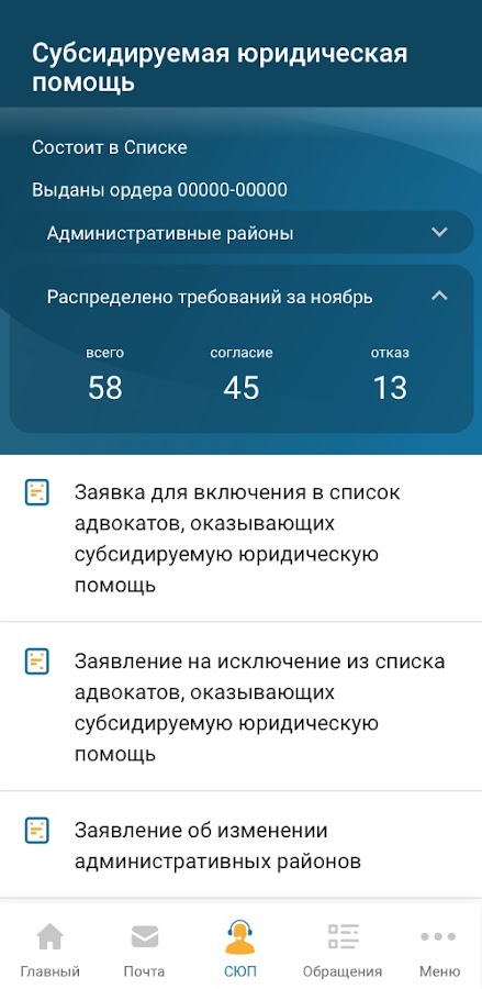 • формирование и направление документов в Центр СЮП (заявка для включения в Список адвокатов, оказывающих субсидируемую юридическую помощь; заявка для посещения подзащитного, содержащего в СИЗО; уведомление Центра субсидируемой юридической помощи о заключении соглашения в интересах конкретного лица; уведомление Центра СЮП о приостановлении деятельности по уважительным причинам и т.п.);