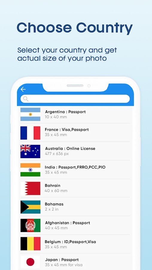 Нет необходимости в навыках редактирования изображений, и с помощью этого приложения можно легко получить фотографию паспортного размера. Это приложение легко обрезает фотографию до размера паспорта без использования какого-либо дорогостоящего программного обеспечения или навыков экспертного уровня. Это приложение также удаляет фон и заменяет его простым фоном любого цвета по вашему выбору.
