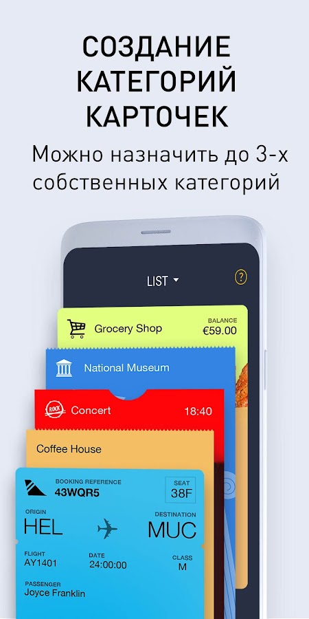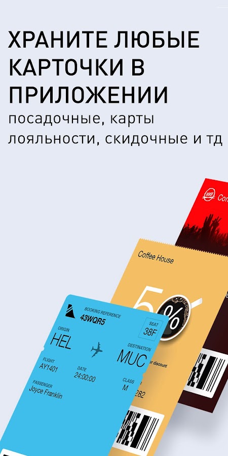 Наше приложение поможет вам организовать и удобно пользоваться посадочными талонами, картами лояльности, купонами от практически любого эмитента карт как авиакомпании, кафе, кинотеатры, рестораны быстрого обслуживания, сети заправок. Эмитенты смогут обновлять выпущенные карточки новой полезной информацией используя стандартный протокол Apple Passbook. Вы можете сохранить неограниченное количество карточек разных видов, таких как посадочные талоны, карты лояльности, ваучеры, билеты, бонусные талоны, сервисные карты, членские карты и другие.