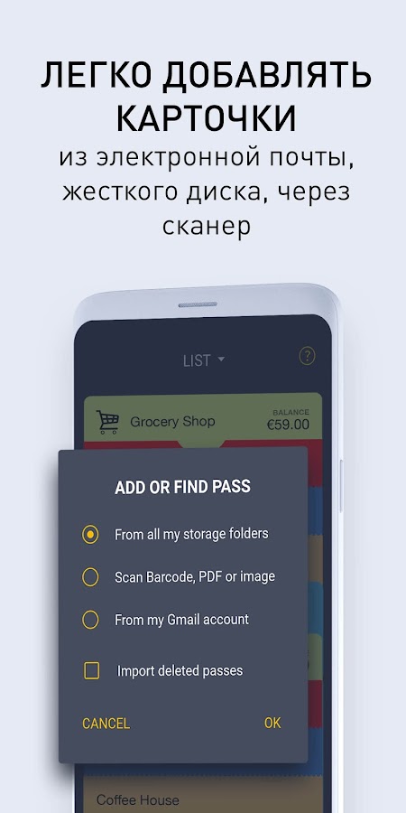 — добавлять карточки из Почтового клиента, из сохраненных на вашем устройстве Файлов или путем сканирования Штрих-кода. (иконка ПЛЮС)