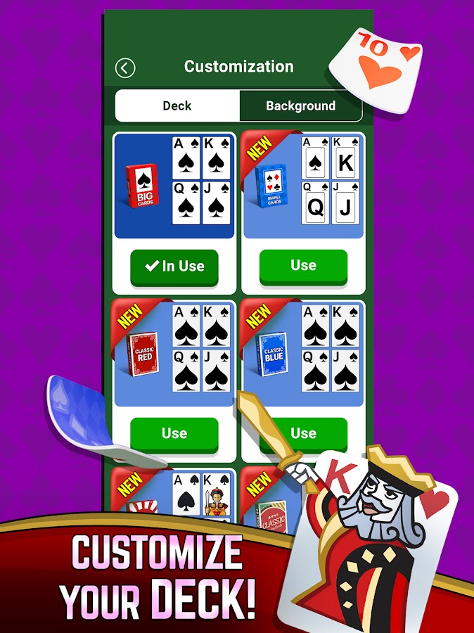 • Customize your Deck and Background while playing solitaire classic free!