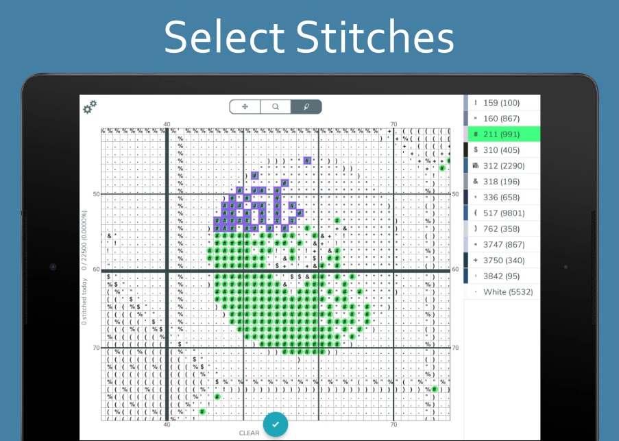 Отметьте законченные стежки. Легко выбирайте, проводя по горизонтали, вертикали или даже по диагонали. Также можно разметить весь квадрат 10 на 10. Если вы импортируете диаграмму, в которой уже есть аннотации, мы попытаемся импортировать их как ваш текущий прогресс. Готовые стежки отображаются в цвете, что упрощает навигацию и сравнение с вашей вышивкой.