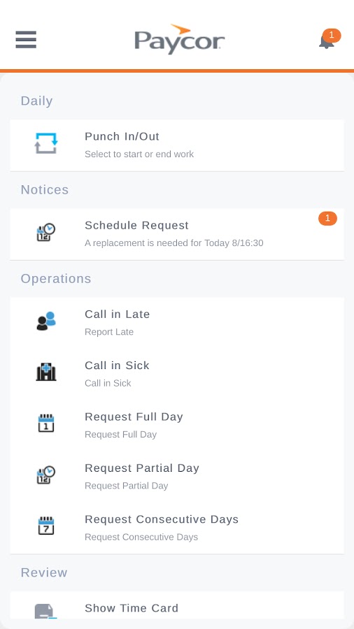 — Когда вы войти вы не можете увидеть все функции, перечисленные выше. Вы будете видеть только функциональные возможности, предоставляемые вашему работодателю Paycor для функций продукта, которые доступны для мобильного доступа. По любым вопросам, пожалуйста, просмотрите часто задаваемые вопросы в разделе Настройки в приложении.