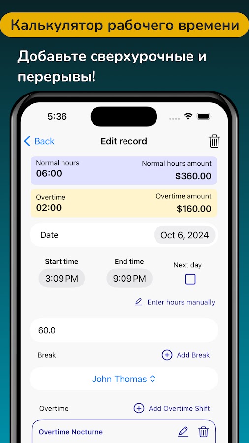 Контролировать сверхурочные в вашей работе станет проще с помощью этого калькулятора часов и минут для работы: Pay Calculator — Time Calculator. Вы сможете узнать количество отработанных часов и зарплату.