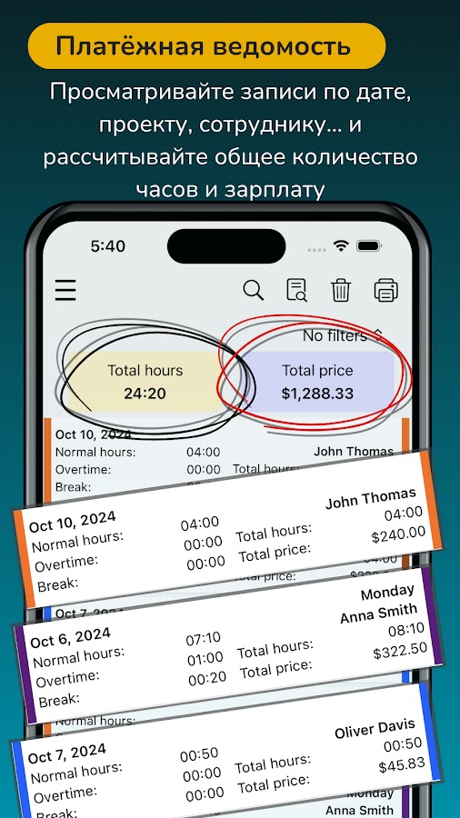 Вы можете производить расчеты в часах и минутах или в десятичном формате, назначать им цену и рассчитывать оплату.