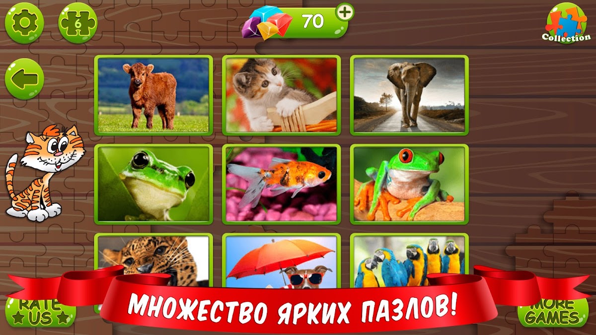 Собирайте пазлы с собаками, пазлы с кошками, ярких разноцветных попугаев, улыбающихся лягушек и даже собаку под зонтом! Можно играть в пазлы на телефоне или планшете даже без интернета.