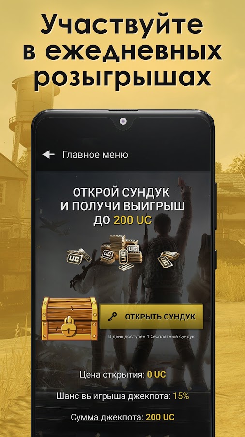Один раз в 24 часа вам предоставляется возможность испытать удачу и забрать UC. Заходи в игру и скорее открывай призовой сундук, там тебя уже ждет награда — усишки.