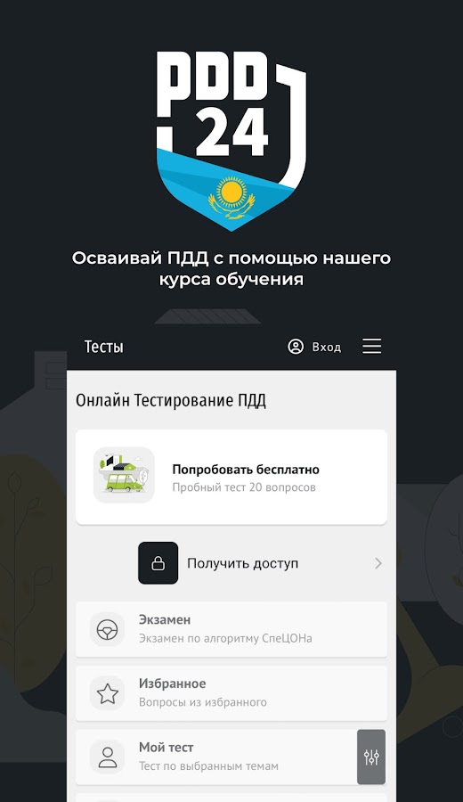 PDD24 – официальное приложение Safety Driving, разработанное компанией, специализирующейся на экзаменационных вопросах по ПДД Республики Казахстан.
