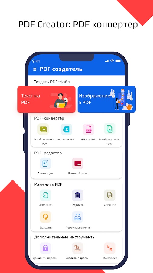 PDF Creator, конвертер, запись в PDF и Reader; Конвертируйте ваши контакты, изображения/фото и HTML-файлы в PDF-файл, а также объединяйте, извлекайте и удаляйте файлы в PDF-конвертере.