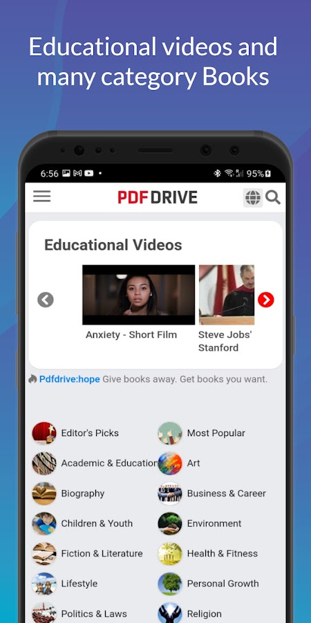 Мы рады сообщить, что наше приложение для Android готово для скачивания в формате APK. PDF Drive — eBooks Download — это простое в использовании приложение, которое позволяет вам быстро получить доступ к миллионам книг. Это приложение для чтения книг, журналов или газет для каждого читателя на своих мобильных устройствах.