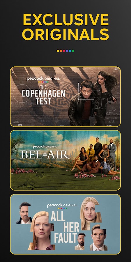 • Эксклюзивные фильмы Peacock Originals, включая «Газету», «Остров любви США», «Предателей», «Twisted Metal», «День Шакала», «Третий лишний» и другие.
