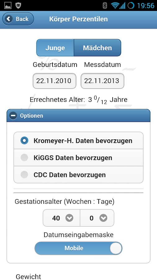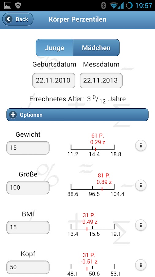 Перцентили тела: расчет различных соматических процентилей (рост, вес, окружность головы, ИМТ и т. Д.) В соответствии с: Kromeyer-Hauschild et al. 2001; Гессе и соавт. 2016; Braegger C et al. 2011 (Züricher продольное исследование); KiGGS исследование RKI 2013; Графики роста ВОЗ; CDC Growth Gharts 2000; Земель и др. 2015 (Mb Down)