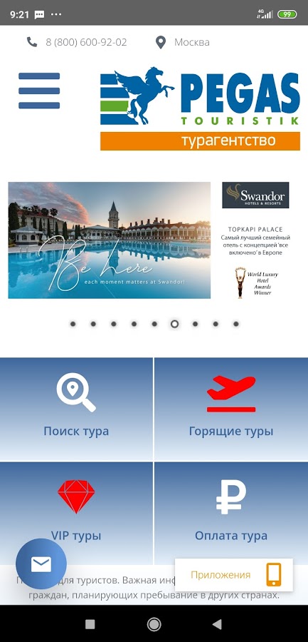 Мобильное приложение турагентства PEGAS Touristik — это эксклюзивный поиск туров туроператора Пегас Туристик.