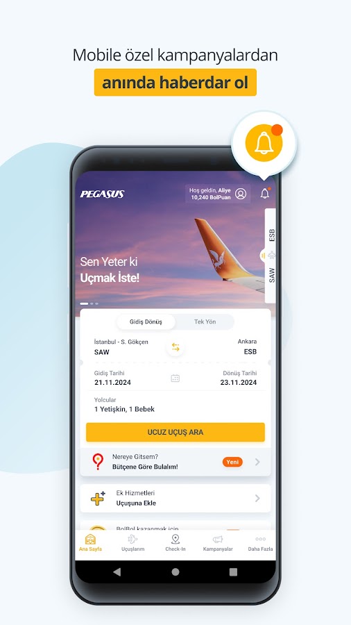 Приложение для бронирования авиабилетов, разработанное для пассажиров Pegasus, следует принципу легкости путешествий. Забронируйте рейс и оплатите ваши авиабилеты после нескольких просмотров и кликов.