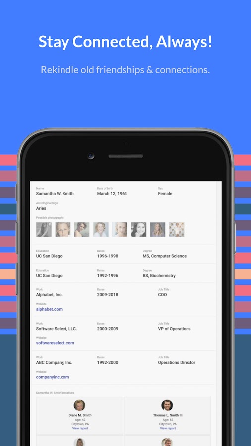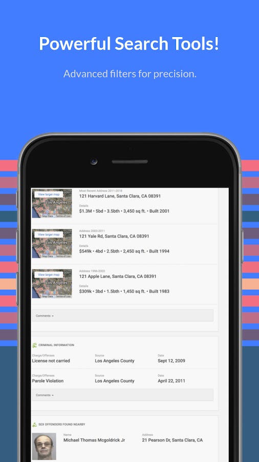 Используя свои сложные возможности поиска, People Finder позволяет быстро и всесторонне исследовать отдельных лиц и компании с помощью простого номера телефона или адреса. Как только вы введете данные, вам будет предоставлена сокровищница общедоступных записей, начиная от истории владения недвижимостью и оценок до криминального прошлого и многого другого.