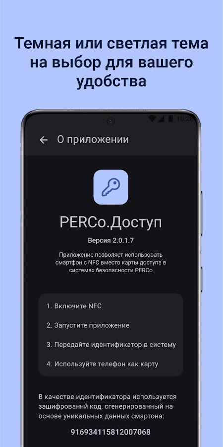 Приложение PERCo.Доступ предназначено для идентификации по смартфону с NFC в системах контроля доступа PERCo.