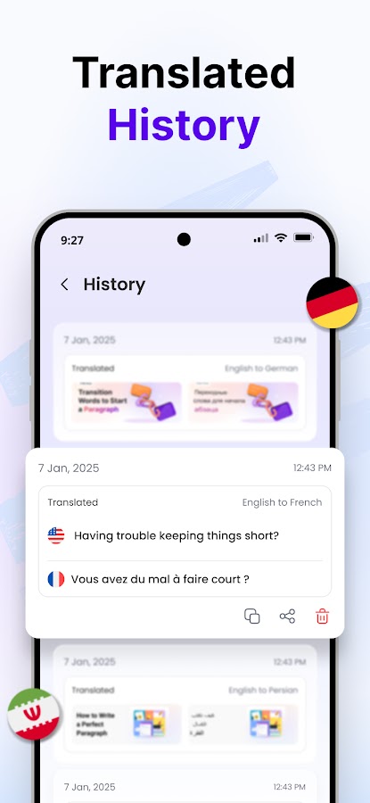 Функция перевода файлов различных форматов позволяет мгновенно и точно переводить ваши документы. Приложение поддерживает множество форматов и позволяет легко переводить файлы DOCX, XLSX, PPTX, TXT и PDF на несколько языков с высокой точностью. Этот переводчик файлов идеально подходит для студентов, специалистов и компаний, которым необходим надёжный и эффективный перевод документов.