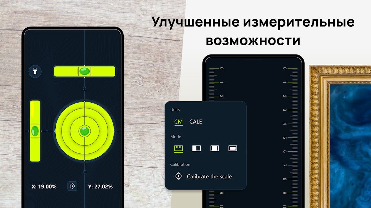 В удобном режиме лазерного уровня, который использует экран камеры, вы можете проверить уровень и угол вашей строительной конструкции (с помощью транспортира) и загрузить показания в блокнот или телефонную галерею.