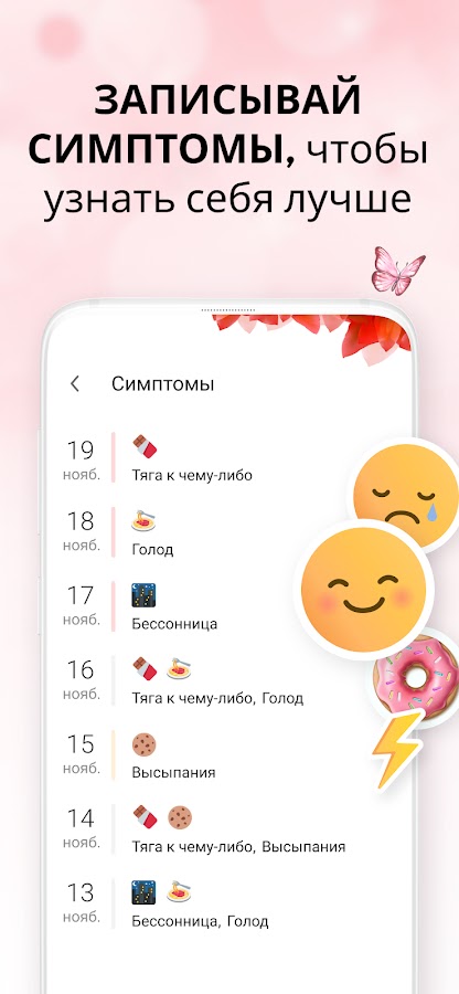 — Детальное отслеживание настроения, симптомов, температуры, веса, овуляции, интенсивности менструации, интимных отношений и применяемых лекарств.