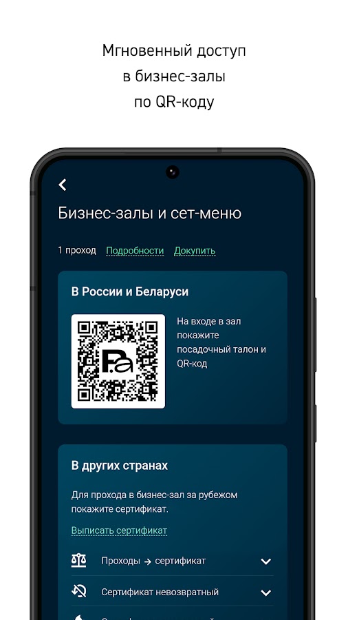 Виртуальная карта Persona.aero даёт доступ в более чем в 1000 бизнес-залов в аэропортах и на вокзалах по всему миру. Для прохода нужен только QR-код карты или сертификат и посадочный талон, чтобы в зале могли убедиться, что это именно вы.