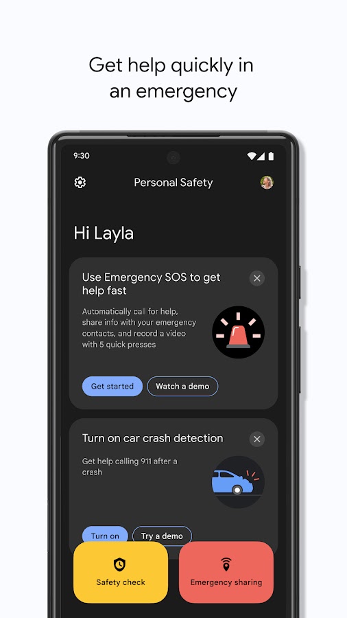 • Проверка безопасности. Вы можете запланировать проверку безопасности, чтобы телефон периодически спрашивал, всё ли у вас в порядке. Если вы не ответите за отведенное время, будет запущена отправка данных в экстренных случаях. Функция также работает с Google Ассистентом.