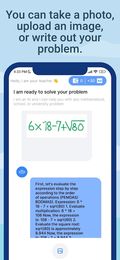 Решение по фото математика позволяет загружать изображения для решение примеров по математике по фото. Теперь вы можете просто загрузить изображение и получить решение в любое время! Независимо от сложности задачи, решение задач по математике по фото становится быстрым и простым с этим приложением.