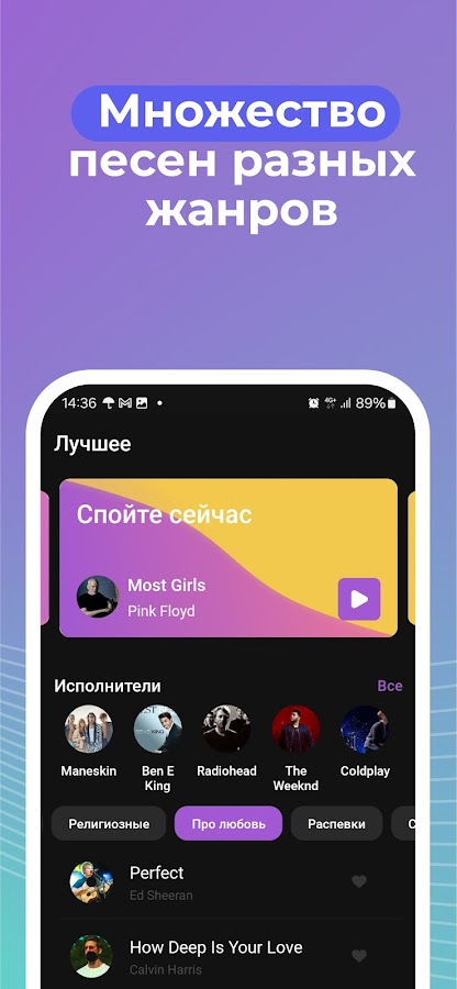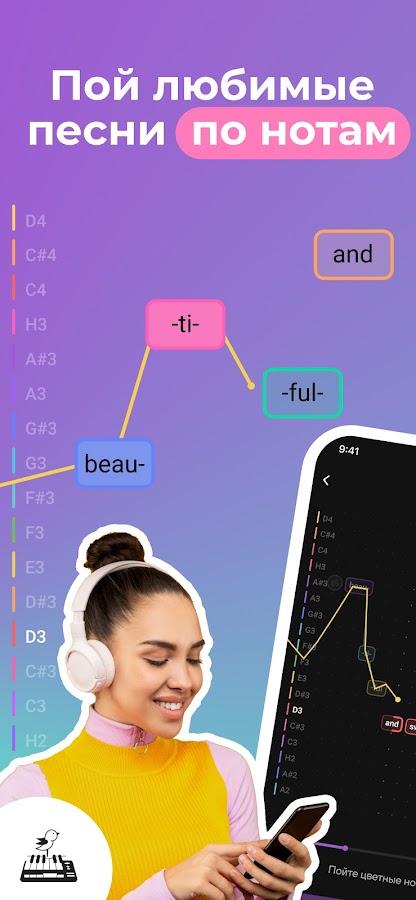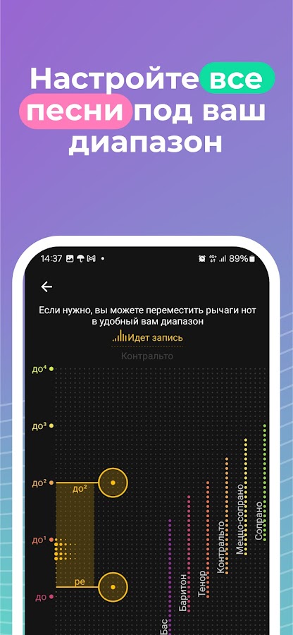 Песни в приложении легко подстраиваются под ваш голос, чтобы вам было удобно петь.