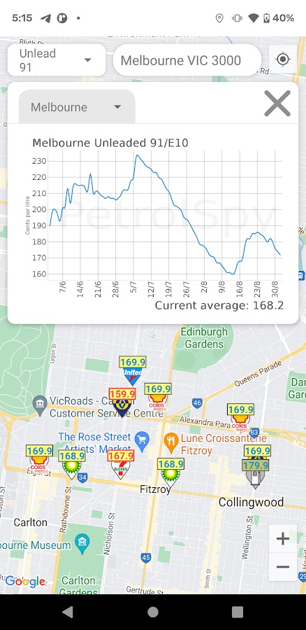 Petrol Spy включает в себя местоположения сайтов Ampol, Caltex, Woolworths, Shell, Coles Express, BP, 7-Eleven, United Petroleum, Puma и многих других независимых операторов.