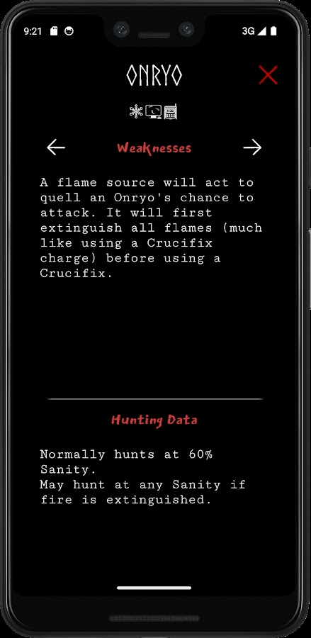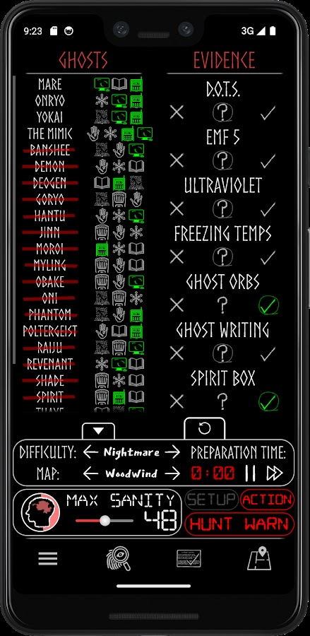 Сузьте круг оставшихся типов призраков! Требуемые для каждого призрака доказательства четко определены, чтобы помочь вам определить, какой тип доказательств остается. Выберите режим сложности, затем выберите наличие доказательств! Устраните определенных призраков, проведя пальцем по их именам.