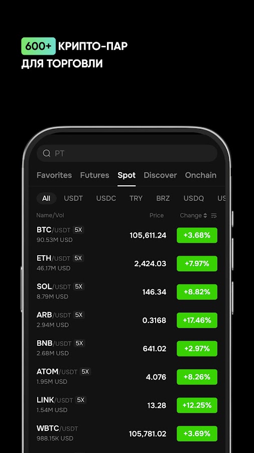 ● Спот-торговля: более 600 пар с высокой ликвидностью и низкими комиссиями.