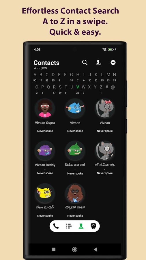 Never struggle to find contacts saved in various languages! Talk supports Kannada, Tamil, Telugu, Hindi, and more, offering precise contact search and organization for everyone.