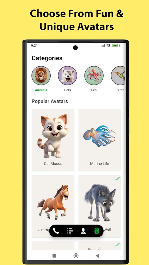 Add a playful touch to your calls with charming avatars! Experience a delightful and colorful interface every time you receive or make a call.Make calling personal! Choose from vibrant avatar packs like animals, pets, moods, and more for your call screen.
