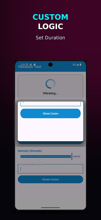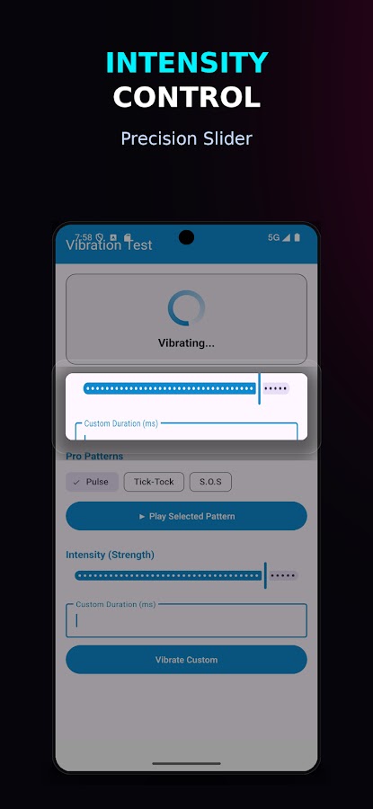 Управляйте силой вибрации! Используйте наш ползунок для проверки различных уровней амплитуды на поддерживаемых устройствах (Android 8.0+). Идеально подходит для проверки слабого и сильного тактильного отклика.