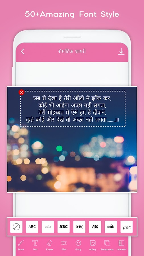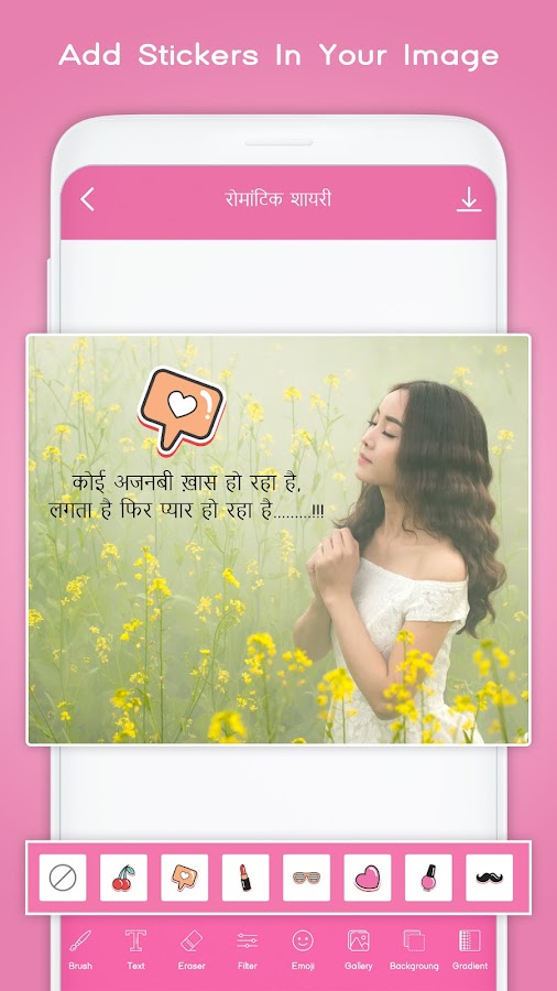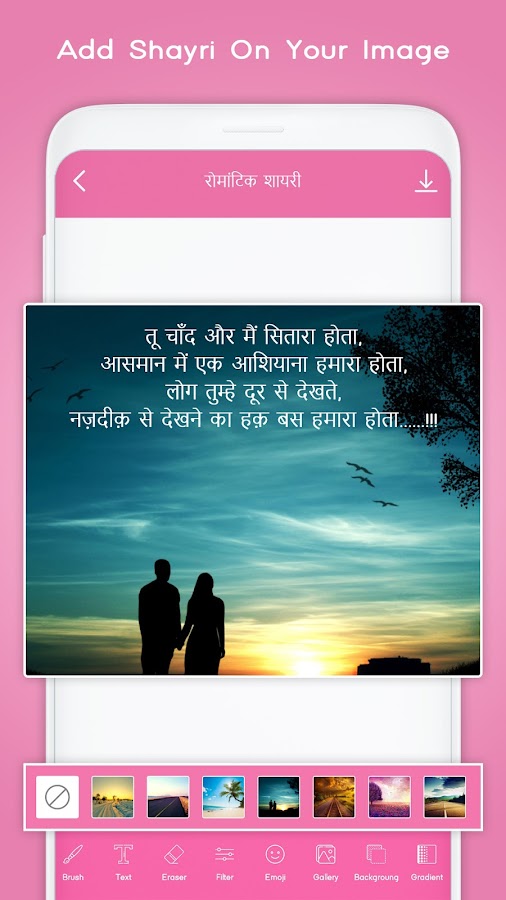 На фотографиях можно написать несколько строк текста на хинди. Загрузите приложение Photo Pe Shayari Wala, чтобы делиться своими фотографиями через все социальные сети.