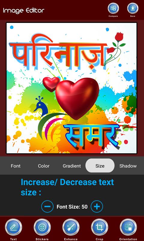 अब फोटो पर अपना या अपने प्रेमिका या दोस्तों का नाम आसानी से लिखिए और शेयर कीजिये | इस एप्प में संपूर्ण और सरल हिंदी कीबोर्ड दिया गया हैं | एप्प में दिए गए स्टाइलिश हिंदी फोंट्स का उपयोग करके आप आकर्षक तरीके से किसी का भी नाम या कोई मैसेज लिख सकते हैं. यह अप्प के माध्यम से आप दिए गए कविता या शेर पेस्ट कर सकते हैं या खुद अपनी कविता, स्टेटस मैसेज, ऐटिटूड, शायरी लिख सकते हैं. फोटो पे नाम लिखे एप्प में दिए गए बैकग्राउंड तस्वीरों पर लिखे या अपनी फ़ोन में स्टोरेज तस्वीरों पर लिखे.