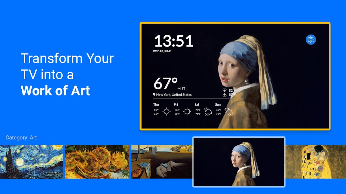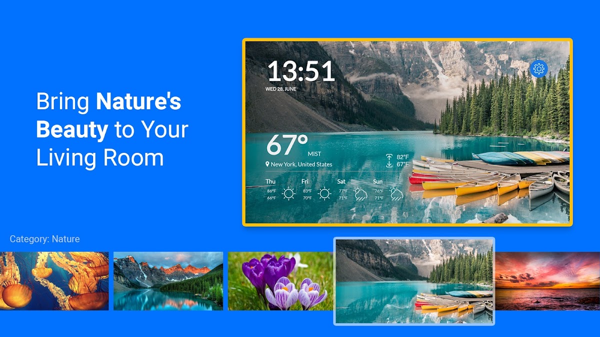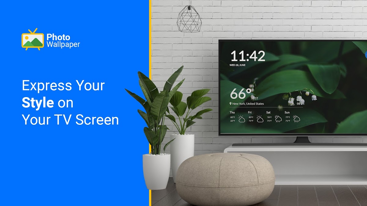 Познакомьтесь с вашим новым лучшим гаджетом для персонализации Android TV — фотообоями, ежедневной информацией о местной погоде и прогнозом погоды, а также удобными часами на экране телевизора.