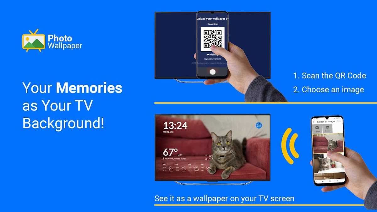 Все, что вам нужно сделать, это отсканировать QR-код с помощью мобильного телефона, выбрать нужные изображения и наблюдать, как волшебство разворачивается на экране вашего телевизора.
