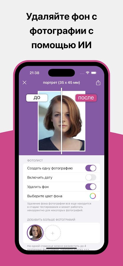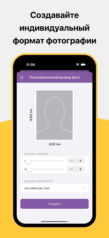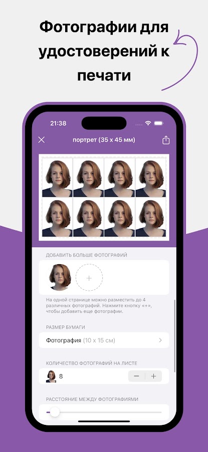 Сделайте снимок, и приложение создаст страницу с точными размерами фотографии для вашего водительского удостоверения, паспорта и стандартной фотографии (35 мм × 45 мм) или любого другого необходимого документа.
