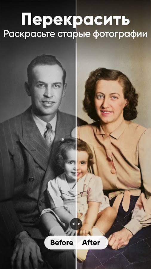 🔸Раскрашивайте фотографии: оживите свои старые фотографии с помощью нашего приложения для улучшения фотографий с искусственным интеллектом, которое позволит вам добавить ярких красок в ваши заветные воспоминания. Раскрашивайте и восстанавливайте старые фотографии, как никогда раньше! Вы можете взять старые черно-белые фотографии, восстановить их цвет и оживить свои воспоминания.