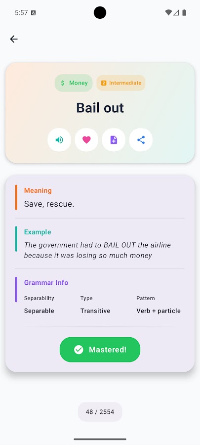 * Добавить фразовый глагол в список избранного.