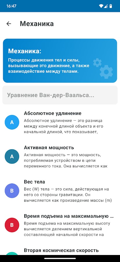 В справочнике ты найдешь теорию, термины и формулы, разделённые на категории. Каждая формула содержит ёмкое описание, а также обозначения переменных.