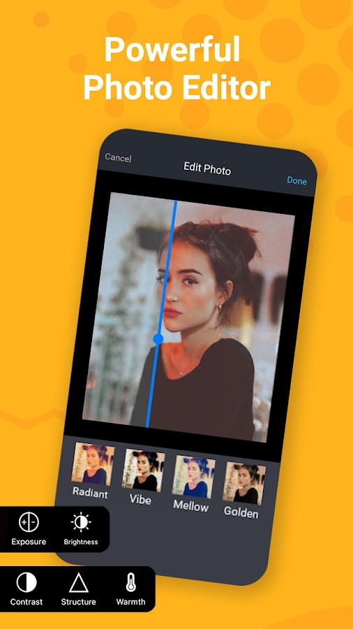 — Эффекты: экспозиция, яркость, контраст, структура, тепло, насыщенность, увядает, подчеркивает, тень, виньетка, резкость