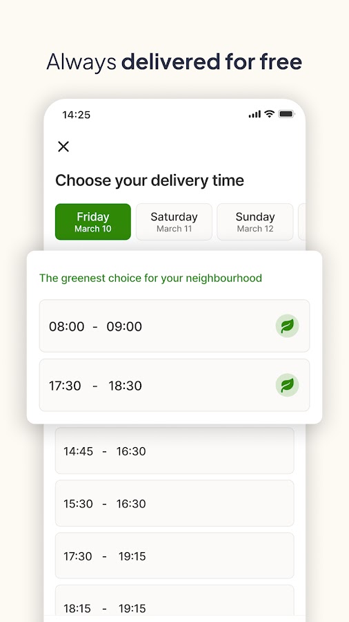 На наших экологичных электромобилях мы проезжаем по окрестностям по продуманным маршрутам. Таким образом, мы гарантируем, что все, что есть в вашем списке покупок, будет доставлено к вам домой с точностью до минуты.